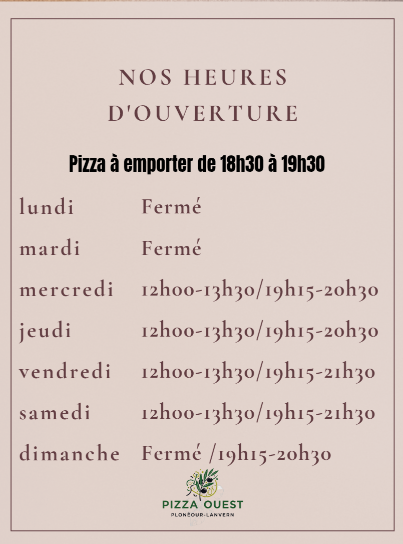 Nous faisons des pizzas à emporter dans la mesure du possible, il est vivement recommandé de réserver vos pizzas dès 17h30 (ou le matin si le restaurant est ouvert à midi, vous pouvez téléphoner à partir de 11h).